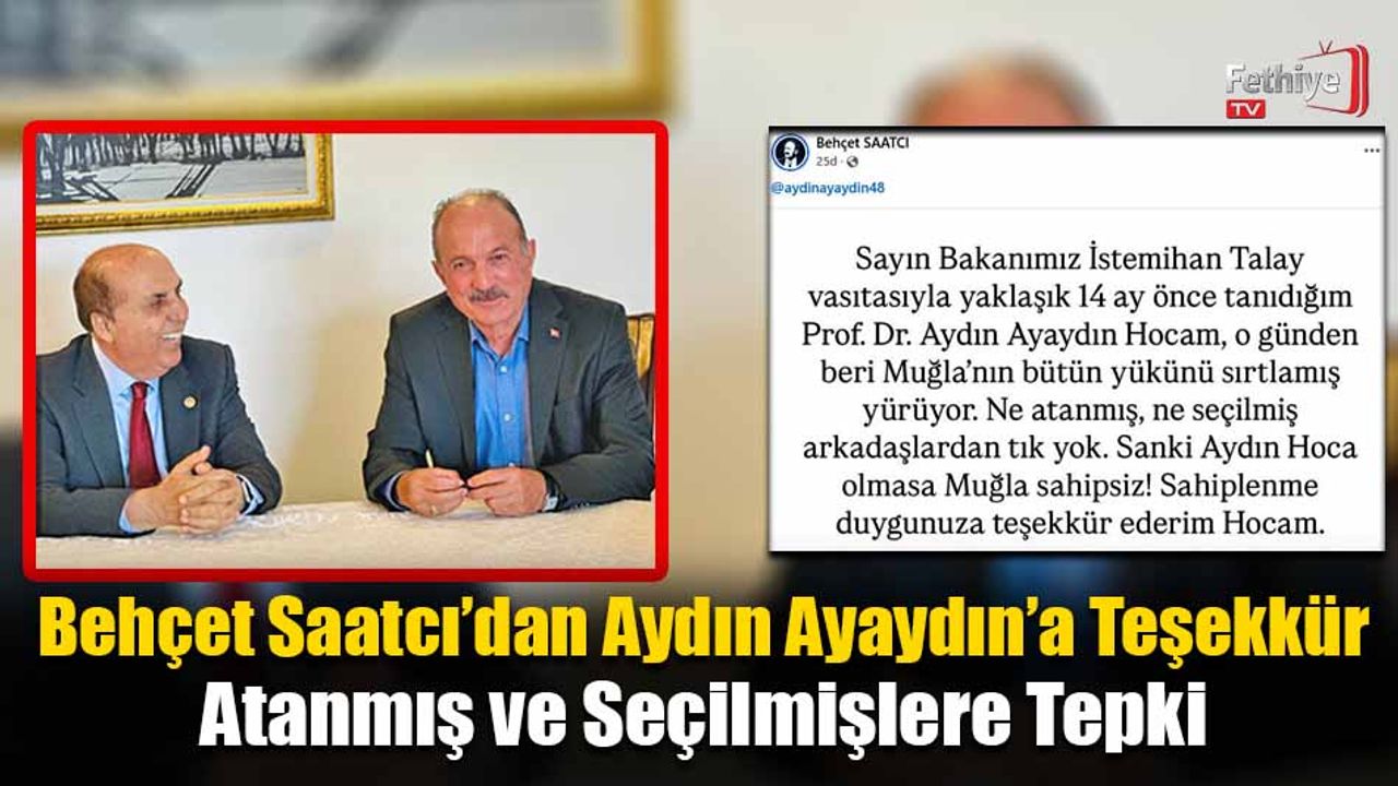 Fethiye'nin eski belediye başkanı Behçet Saatcı, sosyal medya hesabından yaptığı paylaşımla 2024 yerel seçimlerinde AK Parti’den Muğla Büyükşehir Belediye Başkan adayı olan Prof. Dr. Aydın Ayaydın’a teşekkür etti. Saatcı, eski Kültür Bakanı İstemihan Talay aracılığıyla yaklaşık 14 ay önce tanıştığını belirttiği Ayaydın’ın, o günden bu yana Muğla'nın yükünü sırtlandığını ifade etti. Açıklamasında “Ne atanmış, ne seçilmiş arkadaşlardan tık yok. Sanki Aydın Hoca olmasa Muğla sahipsiz!” diyerek mevcut bürokratlara ve yerel yöneticilere sitemde bulundu. Paylaşımında, “Sahiplenme duygunuza teşekkür ederim Hocam” sözleriyle Ayaydın’a desteğini yineleyen Saatcı’nın bu çıkışı, yönetimlere yönelik bir eleştiri olarak değerlendirildi.