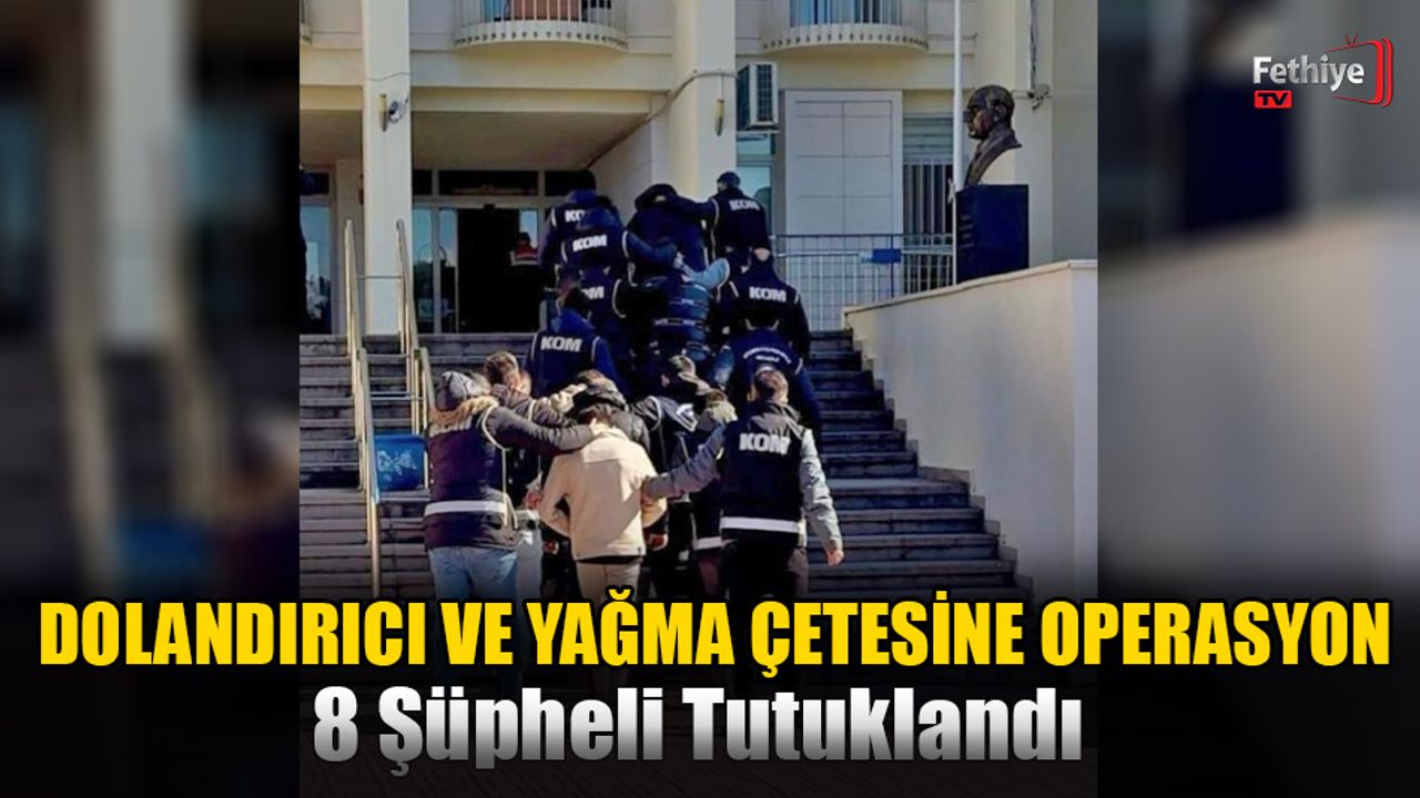Muğla Emniyet Müdürlüğü KOM Şube Müdürlüğü tarafından birden çok kişiyle zorla senet imzalatma suretiyle nitelikli yağma, kişisel bilgileri ele geçirmek suretiyle nitelikli dolandırıcılık ve mala zarar verme/kasten adam öldürmeye teşebbüs suçlarından yürütülen soruşturmalar kapsamında yakalaması yapılan şahıslardan adli mercilere sevk edilen 8 şüpheli tutuklandı, 9 şüpheli hakkında adli kontrol tedbiri uygulandı.