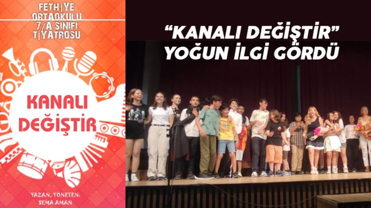 Fethiye Ortaokulu 7/A sınıfı öğrencilerinin oynadığı “Kanalı Değiştir” adlı tiyatro oyunu Fethiye Belediyesi Özer Olgun Kültür Merkezi’nde sahnelendi. Türkçe Öğretmeni Sema Aman’ın yazıp yönettiği tiyatro oyununda televizyon programlarına ve tv dizilerine göndermeler yapıldı.