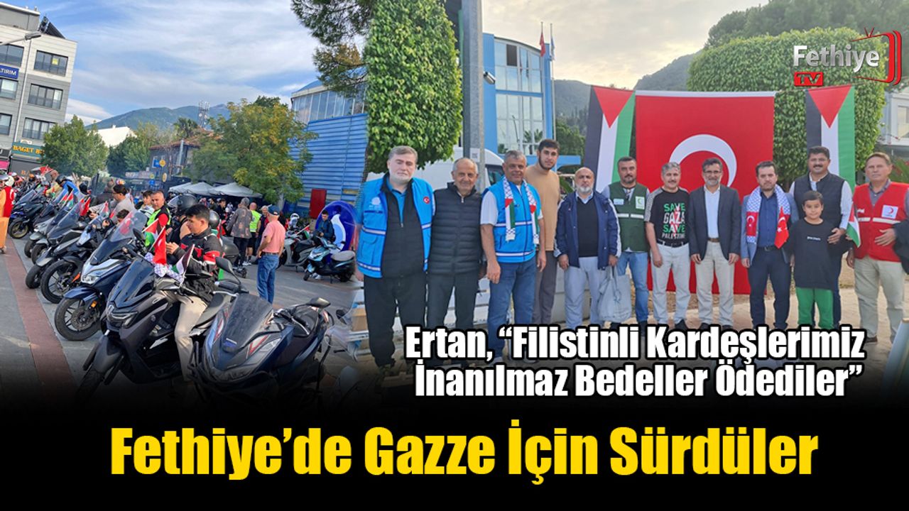 Ertan, “9 Ekim 2025’te Mısır’da yapılan Ateşkes anlaşmasının Yürürlüğe girmesiyle Filistin ve Gazzeli kardeşlerimiz nefes aldılar. Filistin Devleti’nin Başkenti Kudüs olacak şekilde tam bağımsız bir devlet haline gelmesi, barışın devam etmesi, zulmün ortadan kalkması için Dünya Kamuoyunu harekete geçirmemiz gerekiyor. Bizlerde Bugün Fethiye’nin Çırpı mevkiinden Beşkaza Meydanına kadar Motorcularımızla gerçekleştirdiğimiz "Gazze İçin Sür Özgürlük İçin Haykır" sloganıyla Fethiye’den Dünya Kamuoyuna sesimizi duyurmaya çalışıyoruz.” ifadelerinde bulundu.