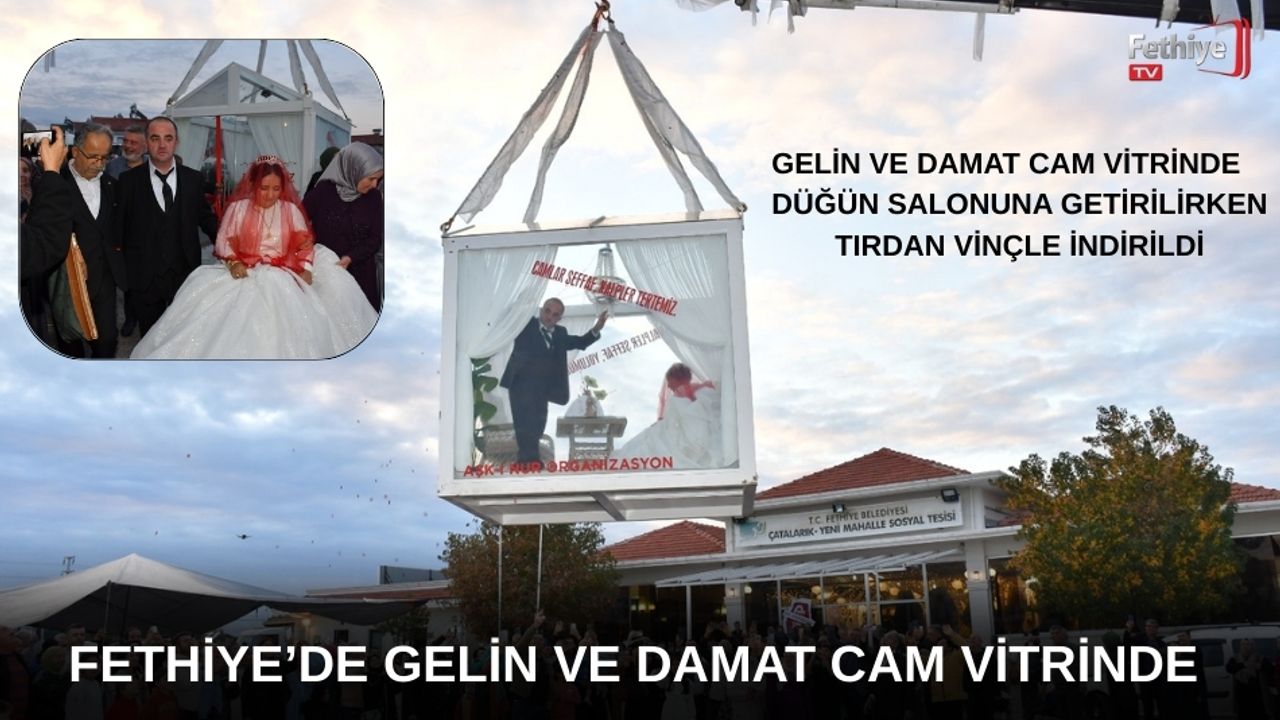 Fethiye ve Seydikemer İlçeleri’nin siyaset, esnaf ve ticaret dünyasından yoğun katılımın olduğu düğün töreninde gelin almaya özel yaptırılıp tıra yüklenen cam vitrin ile gidildi. Cam vitrin kız evinde vinçle tırdan indirilirken, gelin Merve Sarıman ve damat Berat Çetinkaya dualarla cam vitrine girdiler. Gelini alan damat tarafları, konvoy eşliğinde Seydikemer İlçesi’nden Fethiye'ye hareket etti. Tırda gelin ve damadı cam vitrinde görenler, bu anı cep telefonlarıyla görüntülemeye çalıştı. Dualarla cam vitrinden indirilen Berat ve Merve çiftine, büyük alkış yağdı. Fethiye'de uzun yıllar hafızalara kazınacak düğün töreni, renkli görüntülere sahne oldu.