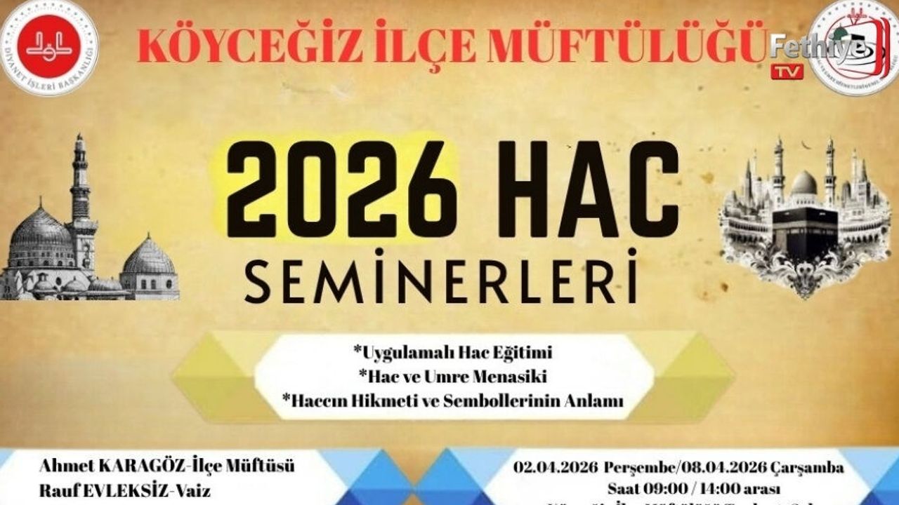 Köyceğiz İlçe Müftülüğü’nün sosyal medya hesabında yaptığı açıklamada; "Ömürlerinde bir defa yaşayacakları hac yolculuğuna hazırlamak, gerekli eğitim ve rehberliği sunmak, bu yolculuğu hayatlarında manevi bir milat haline dönüştürmek ve hac organizasyonlarında karşılaşılan problemleri en aza indirmek amacıyla 2026 yılı Diyanet İşleri Başkanlığı ve Seyahat Acenteleri organizasyonu ile Köyceğiz İlçemizden Hacca gitmek üzere kesin kayıt hakkı elde eden Hacı adaylarımız için Köyceğiz İlçe Müftülüğü toplantı salonunda 02 Nisan 2026 Perşembe günü ile 08 Nisan 2026 Çarşamba günleri 09:00-14.00 saatleri arasında Hac Eğitim Semineri düzenlenecektir. Allah bu sene hac yolculuğuna çıkacak olan kardeşlerimize kolaylıklar ihsan eylesin. Daha önce gidenlere umre gidemeyen kardeşlerimize de en kısa zamanda hac farizasını ifa etmeyi nasip eylesin" ifadelerine yer verildi.