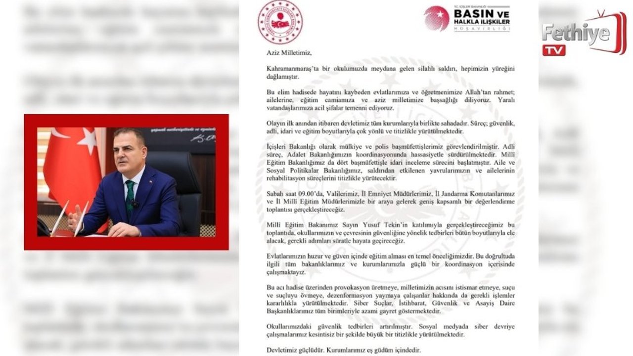 Kahramanmaraş’ta bir okulumuzda meydana gelen silahlı saldırı, hepimizin yüreğini dağlamıştır. Bu elim hadisede hayatını kaybeden evlatlarımıza ve öğretmenimize Allah’tan rahmet; ailelerine, eğitim camiamıza ve aziz milletimize başsağlığı diliyoruz. Yaralı vatandaşlarımıza acil şifalar temenni ediyoruz. Olayın ilk anından itibaren devletimiz tüm kurumlarıyla birlikte sahadadır. Süreç; güvenlik, adli, idari ve eğitim boyutlarıyla çok yönlü ve titizlikle yürütülmektedir.