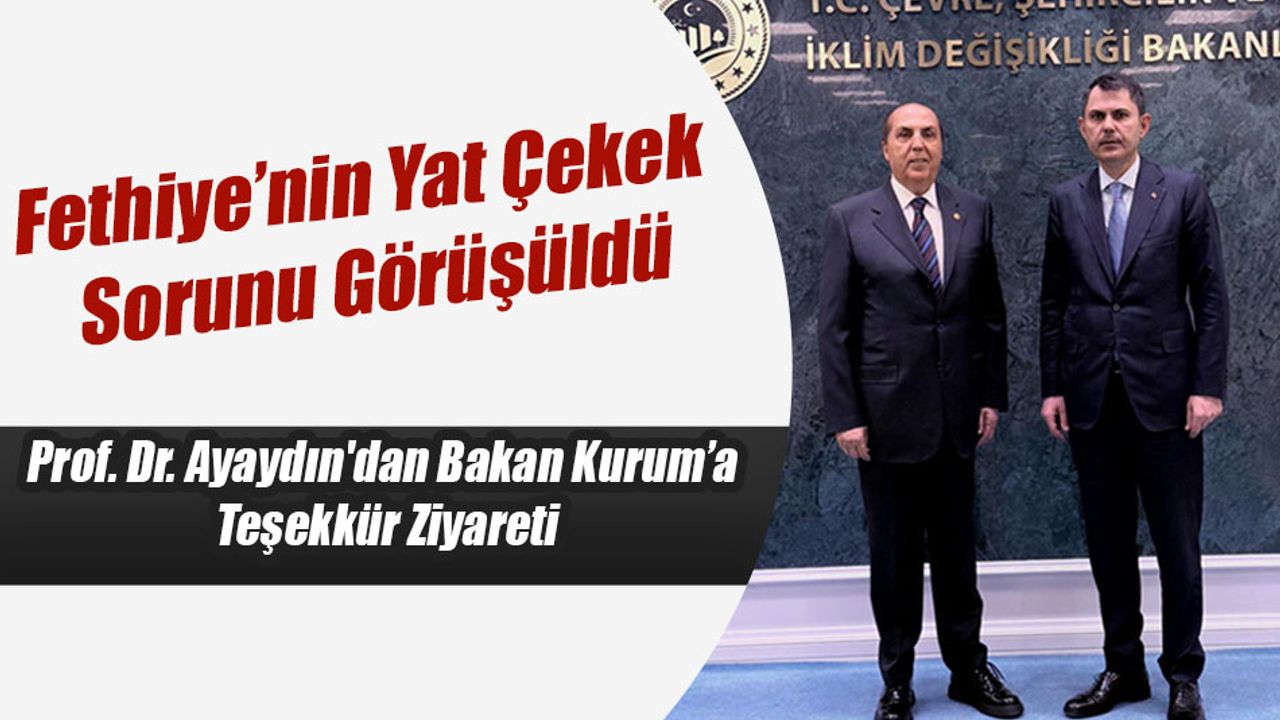 Prof. Dr. Ayaydın, Fethiye Körfezi’nin kirliliğine yol açan unsurlardan biri olan “yat çekek yeri”nin ricası üzerine Karaot bölgesine kaldırılması ile ilgili olur veren Çevre Şehircilik ve İklim Değişikliği Bakanı Murat Kurum’a teşekkür ziyaretinde bulundu.