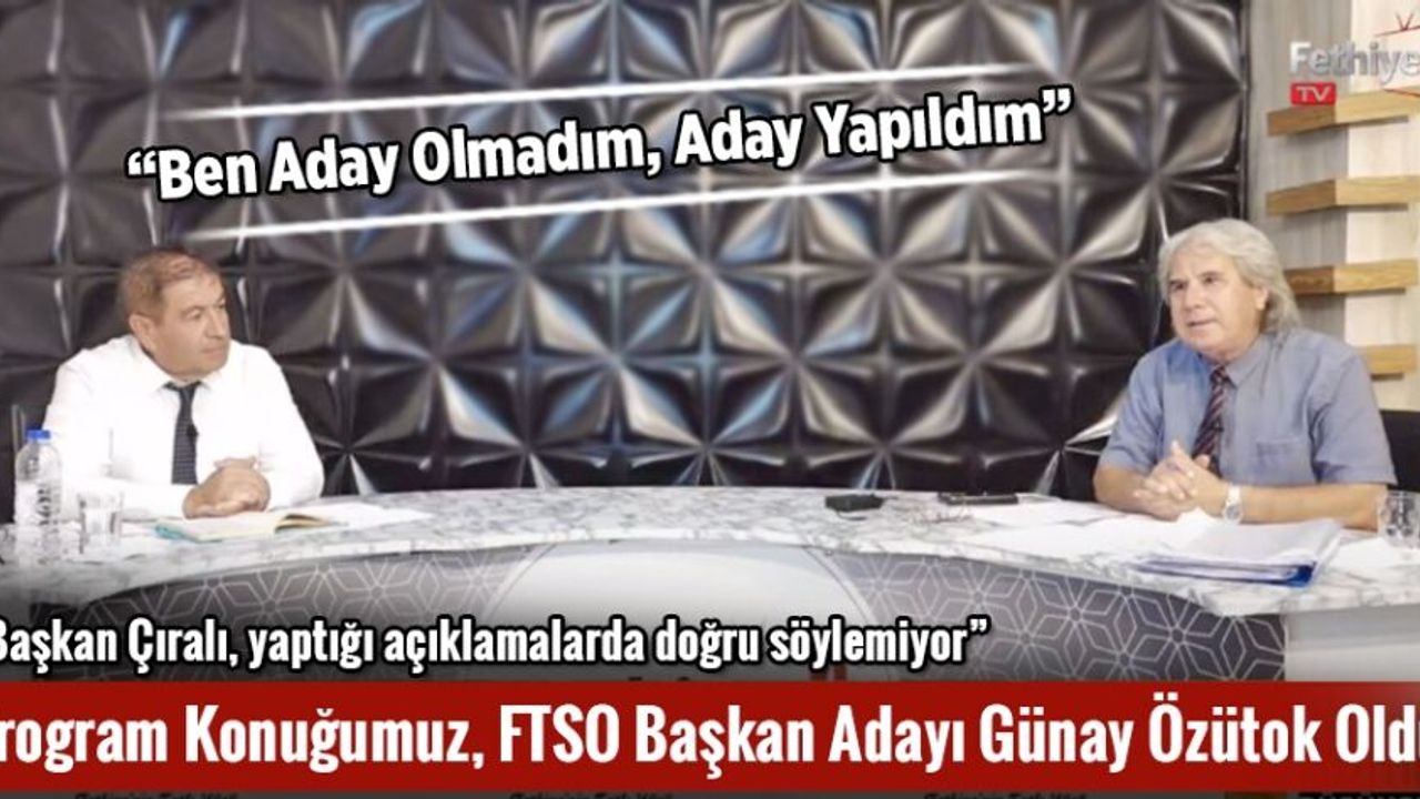 FTSO başkanlık adayı olma sürecini anlatan Özütok, programda klasik başkan olmayacağının vurgusunu yaptı. Özütok klasik başkandan vurgusunda ise şu sözlere yer verdi; “ Sorunun bir başkan seçmek olmadığını biliyorum. Sorun Günay Özütok başkan olduğu zaman değil birlikte olunduğu zaman çözülecek sorun. Ben arkadaşlarıma beni başkan yapmak için gelecekseniz gelmeyin, sorunları çözmek için gelin dedim. Ben klasik başkan olmayacak. Geçmişteki arkadaşlar kötü niyetli olduğundan değil takım olunmadığı için bir şeyler ortaya konulamıyor. Değişim istemekle değişim olmuyor. Sonuç olarak biz yönetimi yeterli görmüyoruz. Her yönetimin kendine göre bir tarzı bir sistemi vardır. Yapılanlar olur yapılamayanlar olur. Ben Osman başkanın yaptıklarını yeterli görmüyorum, görmüyoruz. Bundan dolayı biz aday olduk. “ diye konuştu.